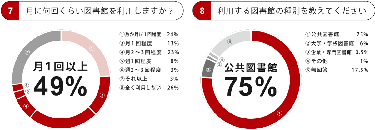 回答者が社会人であることから、公共図書館の利用が75%を占めています。一方、大学図書館の利用は6%にとどまり、一般利用に関する認知度が低いことが伺えます。また、新型コロナウイルス感染拡大の影響で図書館利用が制限されていることを受け、25%が利用が減ったと回答。ただ、多くは変わらず利用を続けており、スタイルの変化はあっても、利用そのものは極端に落ち込んでいないことが分かります。